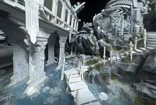 Adapted a scene from Confusion of Princes into a set for a university project. Reimagined as a scorching desert world, the spaceship junkyard became a community of vessel-dwelling survivors trading salvaged trash to avoid execution by the "death master." The design featured elevated, robotic-legged vessels housing humans and Shubians